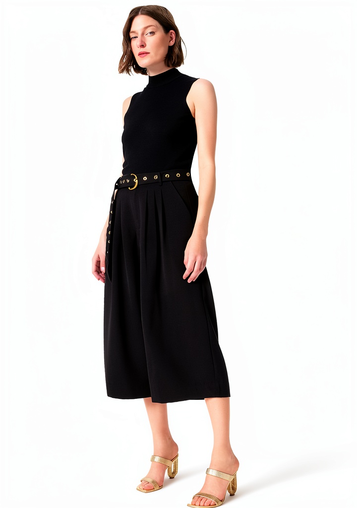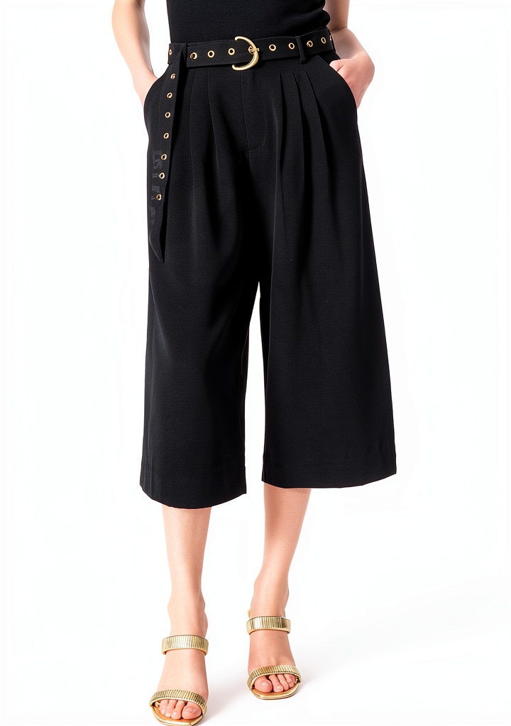 Dee Ocleppo presents high-waist belted crop pants designed for modern women seeking style and functionality. These pants feature a pleated front, four functional pockets, and a front zipper fly on a wide crop leg, crafted to offer a flattering fit and practical storage. With a length of 23 inches from crotch to hemline and a 26-inch leg opening, they provide a comfortable, tailored look. Made from quality materials, these pants are part of the DO collection, which focuses on elevating everyday dressing into an art form, ensuring ease and elegance for various occasions.